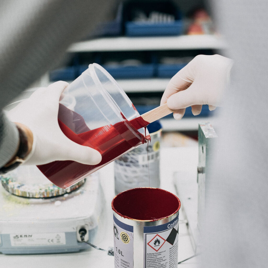 Tack vare att vi blandar färgerna själva anpassar vi mängden färg i en behållare så att du får exakt så mycket du behöver – från 35 g till en lastbil. Det innebär även att vi kan anpassar mängden för att kunna köra ett skift och behöver ni härdare förbereder vi en liten spruta med rätt mängd för det skift. Allt för att underlätta för dig.